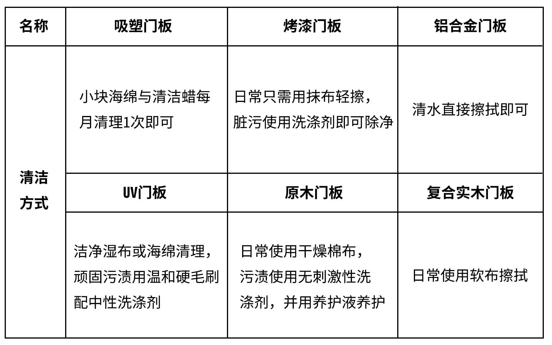 清洁简易度选购排行榜:复合实木门板>吸塑门板>铝合金门板>烤漆门板=UV门板>原木门板
