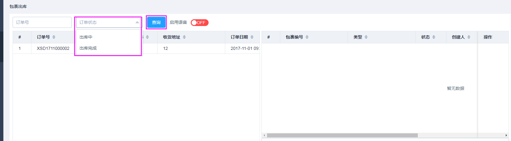 出库的包裹数据显示在下面框