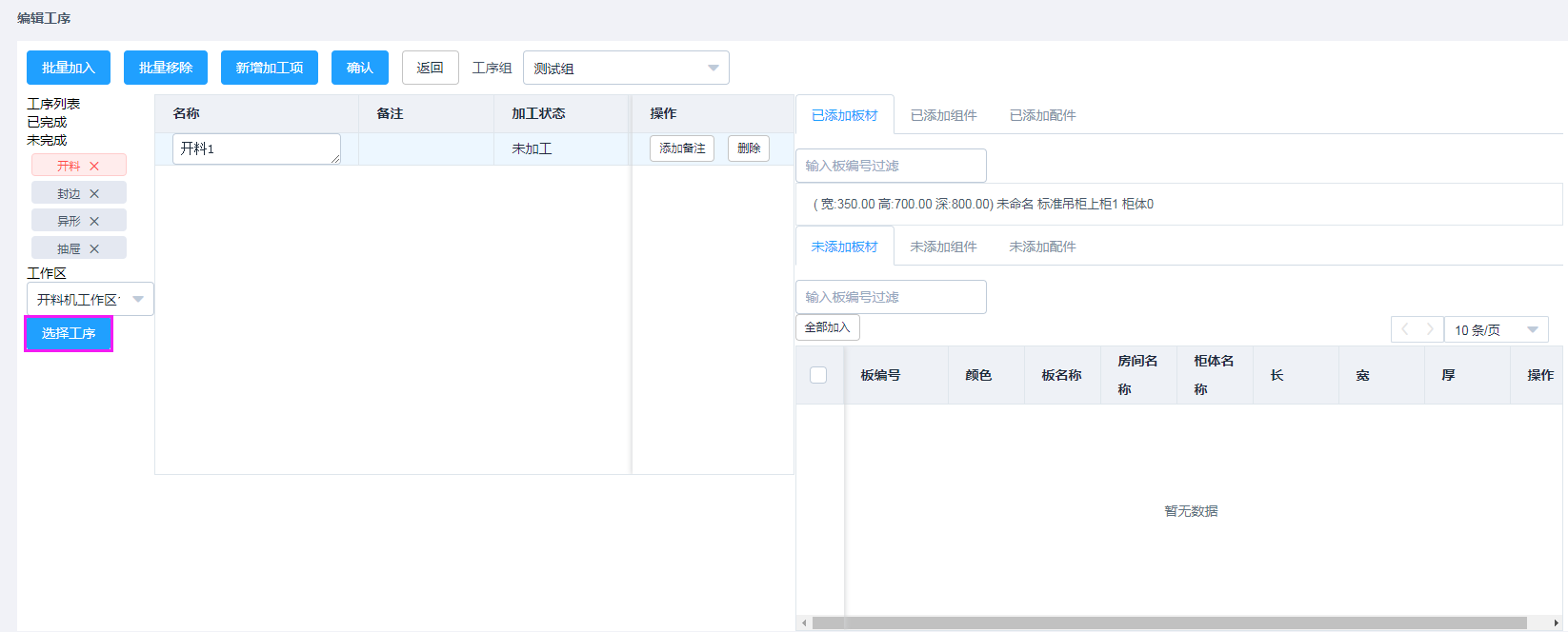 选择某道工序编辑加入某个板材或者组件,可以在每条数据后面点击“加入”,或者选择多条数据,点击“批量加入”按钮,或者点击全部加入;