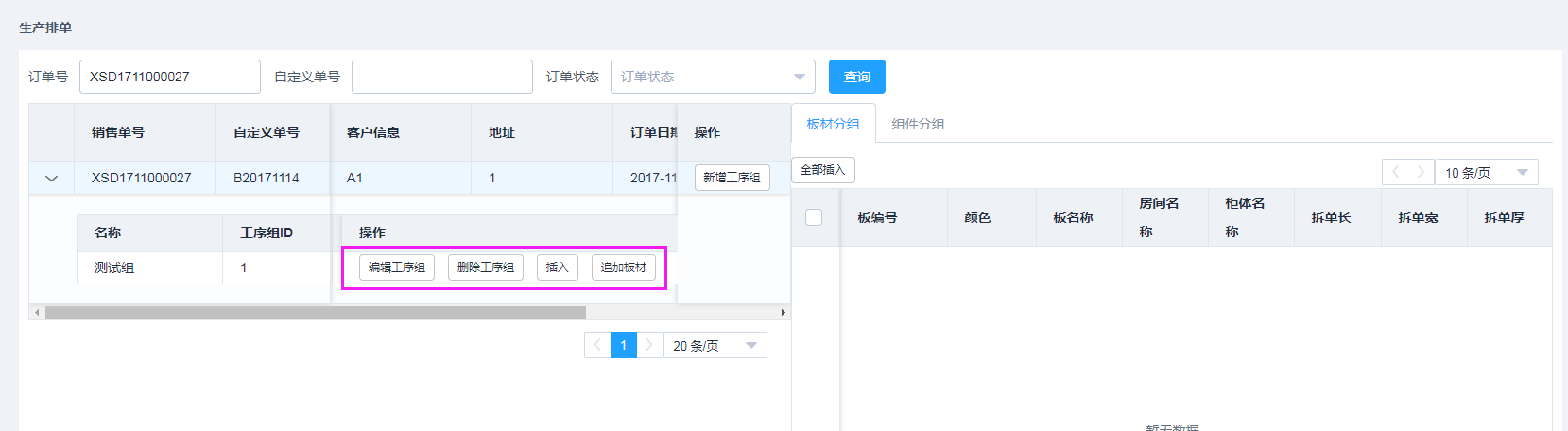在未生成工序组之前,用户可以自定义该笔订单需要生成工序组的板件,勾选板件结束后,点击生成工序组按钮