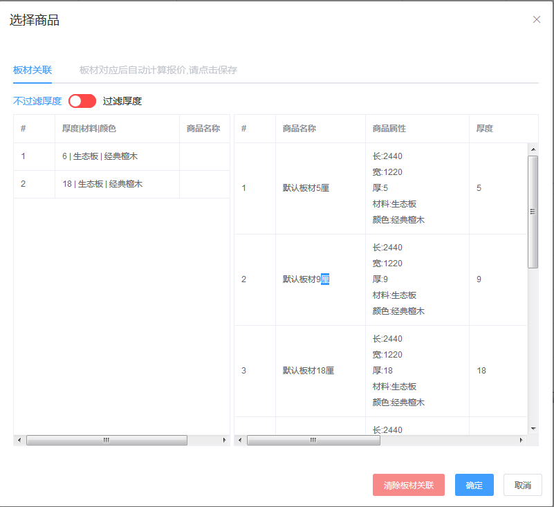 如果点击清除板件关联,则板材对应关系取消,用户可重新进行板材对应;