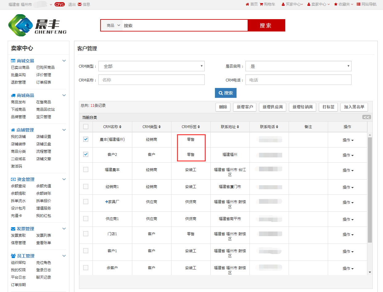 对于新增订单页面添加的客户和经销商,用户可在客户管理中对其进行打标签,选择客户或者经销商,点击打标签