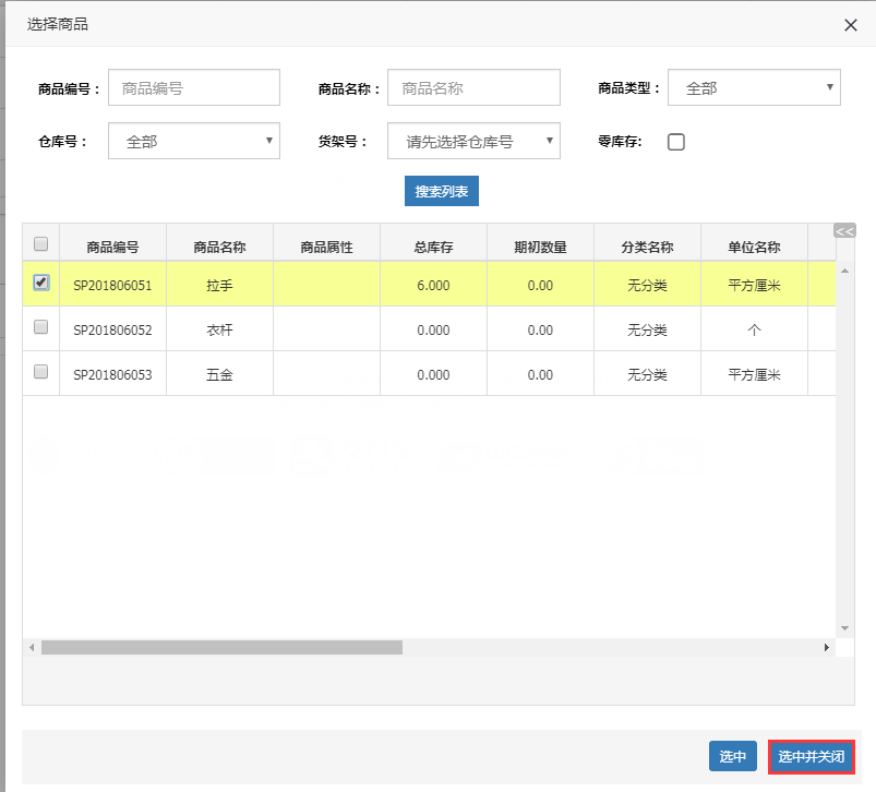 商品选择成功,用户可以修改单位,数量,调出仓库,调入仓库;