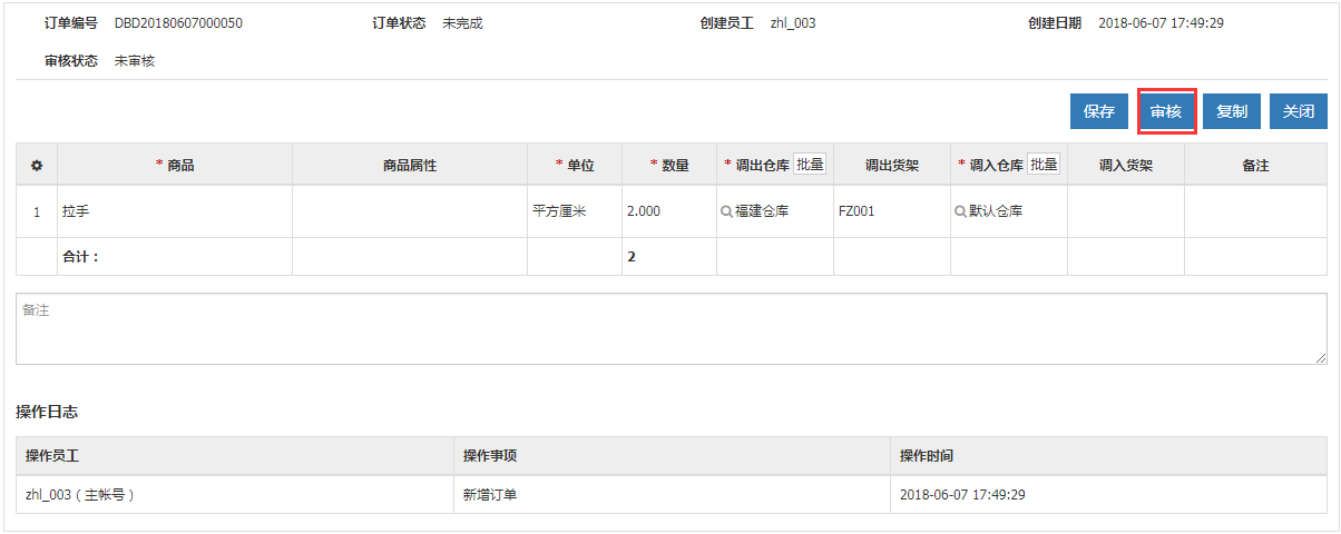- 商品总库存数量不变,但是调出的仓库库存数量增加,调入仓库数量减少