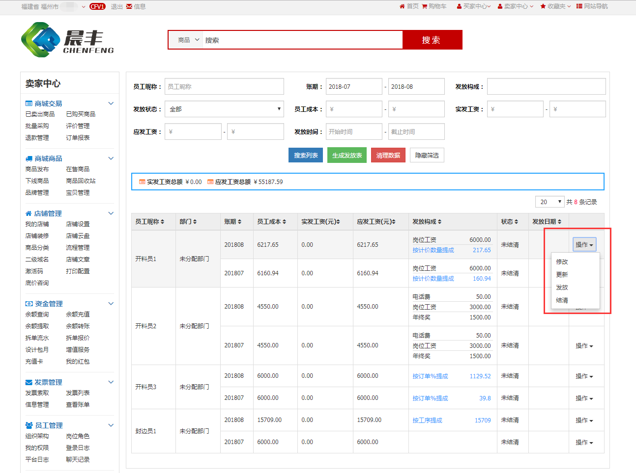 在薪资发放页面,选择员工薪资点击操作按纽可对员工薪资进行修改和更新