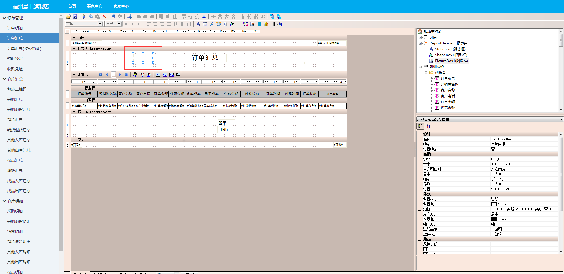可在报表的表头中上传图片,点击报表设计中的图像框