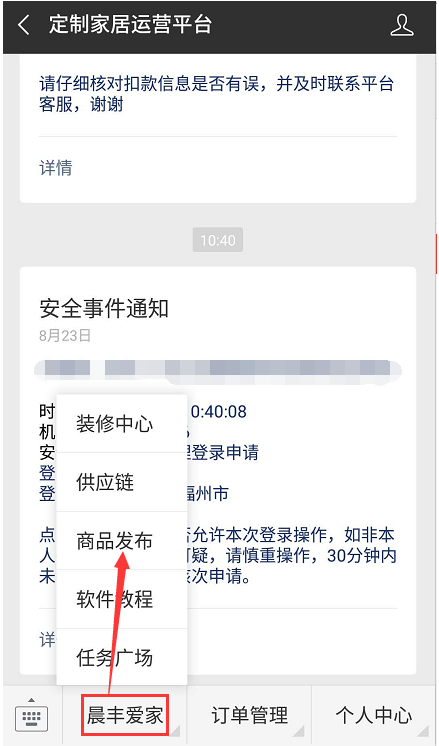 用户还在手机端进行商品发布,在晨丰微信公众号:定制家居运营平台点击晨丰爱家-商品发布
