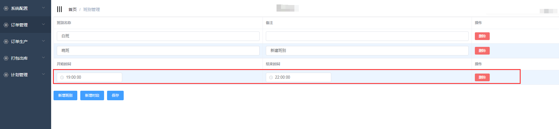 点击计划管理-班别管理,进入班别管理页面;班别管理设置的是工厂一天的上班时间