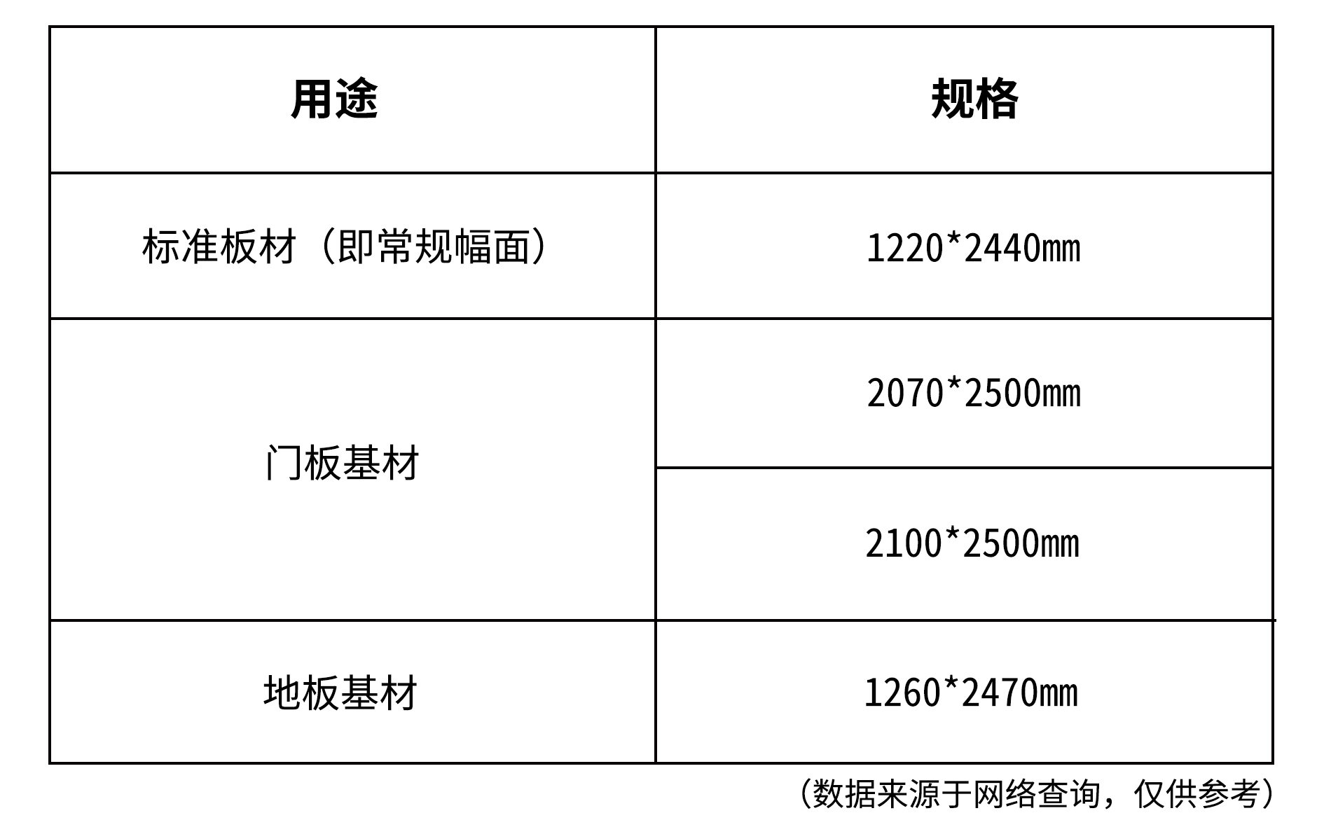 密度板虽然工艺流程颇为繁琐,但易于加工的特性,增加了密度板被定制多样尺寸的可能,日益花样繁多的消费者需求,使密度板因用途、或是消费者意愿诉求上的不同,有着各不相同的尺寸,其大致尺寸规格范围如下: