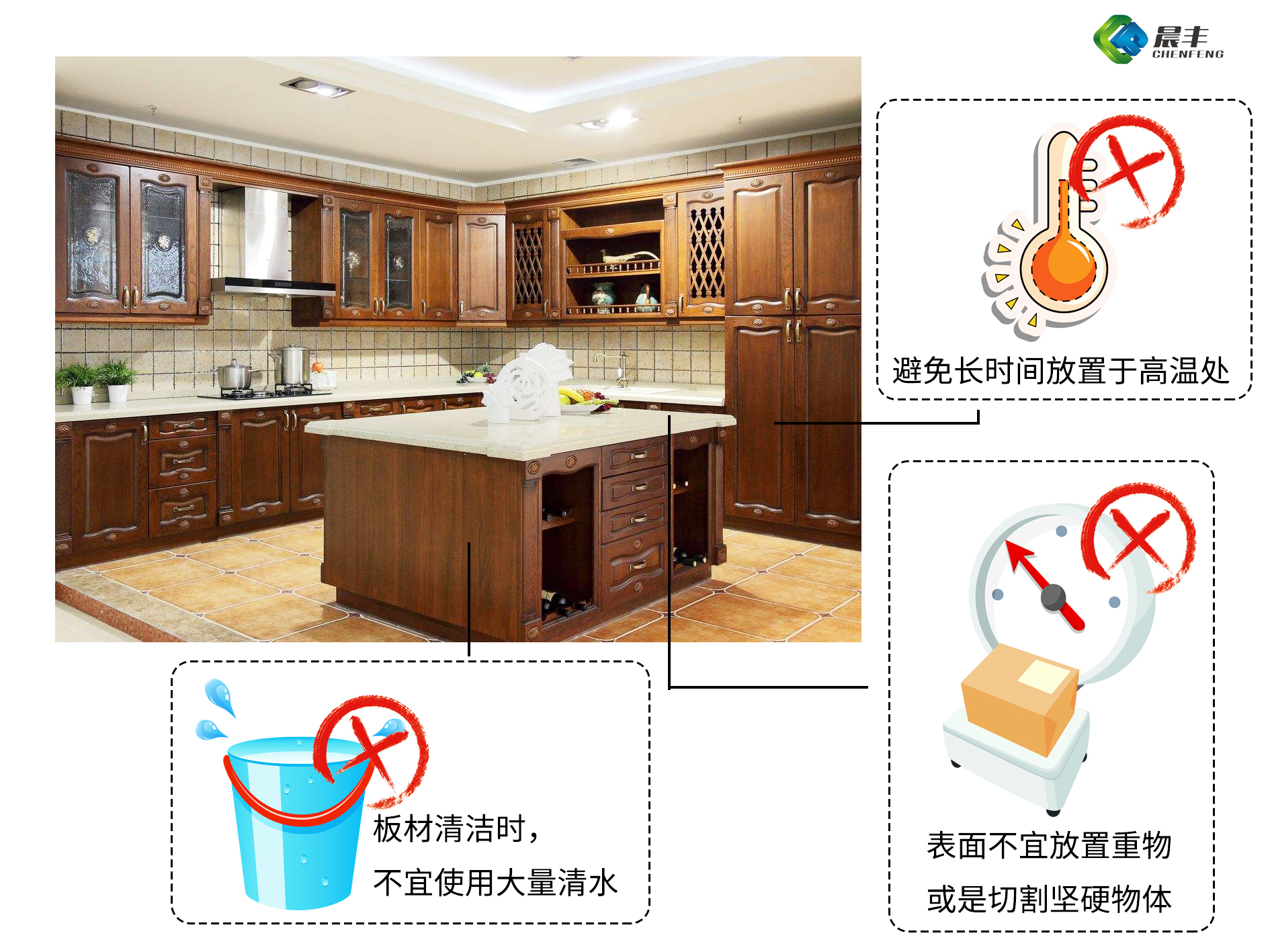 ②表面不宜放置重物或是切割坚硬物体,否则会损坏板材表面;