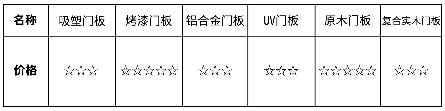 价格选购排行榜:复合实木门板>吸塑门板>UV门板>铝合金门板>烤漆门板>原木门板